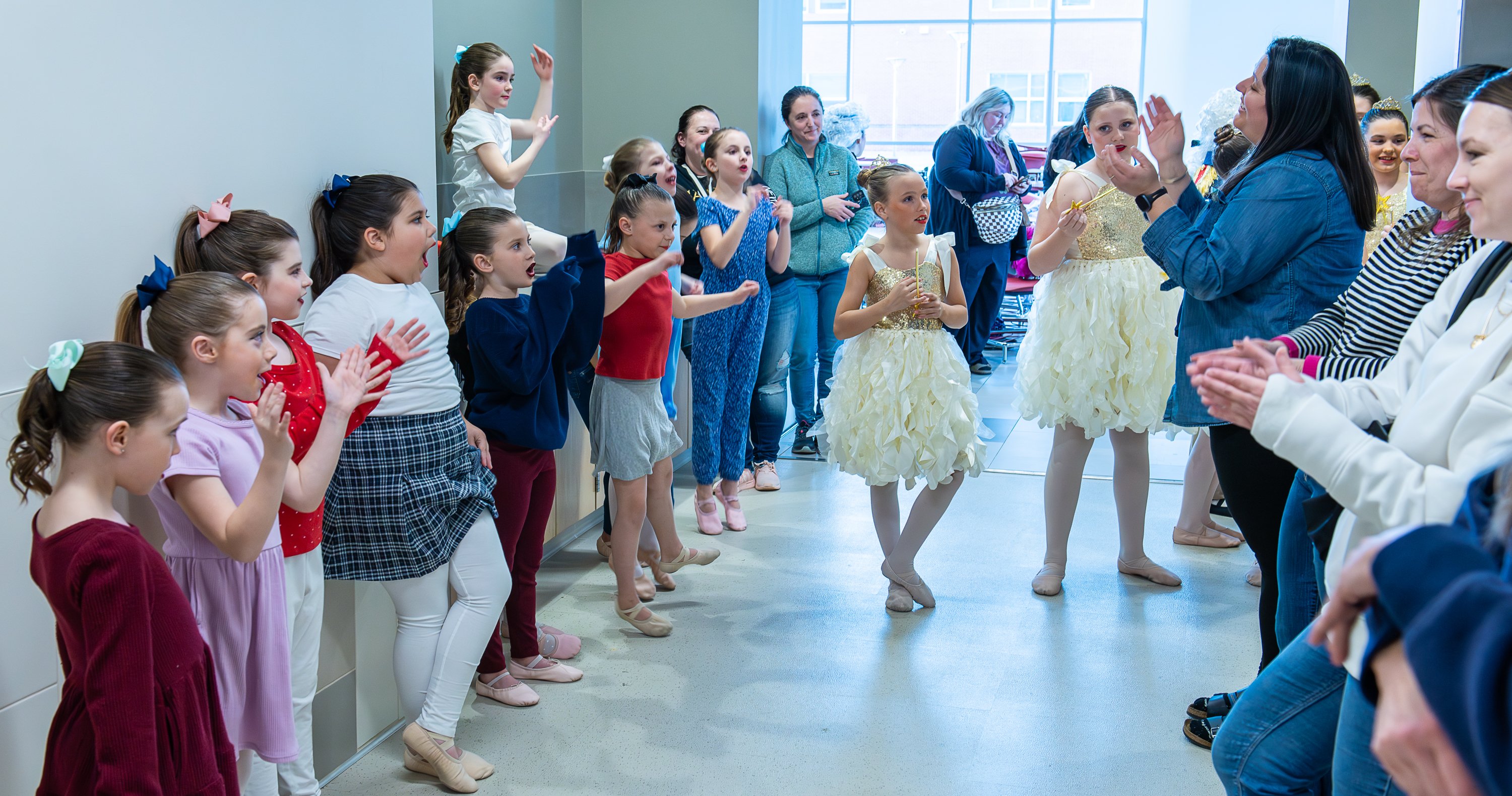 Purchase this imageAUBURN, March 25, 2026 – Kate Hazelton, engages dancers with a song as they wait to go on stage during Wednesday night’s dress rehearsal for this weekend’s performance of an adaptation of the classic story of Cinderella created and performed by Ballet LA from the Dance Center in Auburn. “I have two kiddos performing, so I’m here as a parent, but I’m a Pre-K teacher during my day job, so I’m good at keeping kids entertained.” she said. Performances will take place Friday at 7PM and Saturday at 1 & 7PM at the Donald M. Gay Performing Arts Center at Edward Little High School in Auburn. (Russ Dillingham/Staff Photographer)