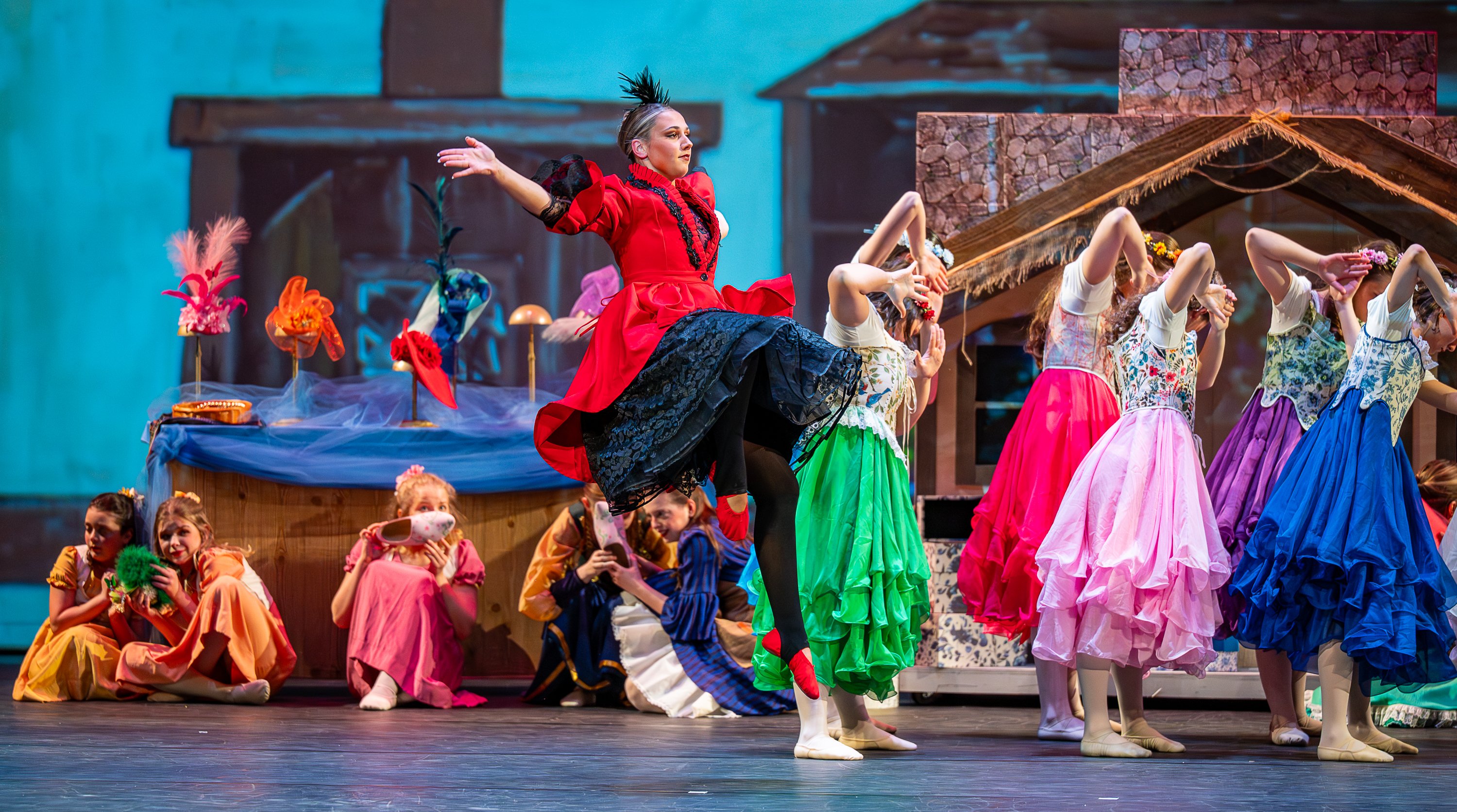 Purchase this imageAUBURN, March 25, 2026 – Eliza Pullen, middle, playing the Evil Step Mother, leaps through the air during Act 1 of Wednesday night’s dress rehearsal for this weekend’s performance of an adaptation of the classic story of Cinderella created and performed by Ballet LA from the Dance Center in Auburn. Performances will take place Friday at 7PM and Saturday at 1 & 7PM at the Donald M. Gay Performing Arts Center at Edward Little High School in Auburn. (Russ Dillingham/Staff Photographer)