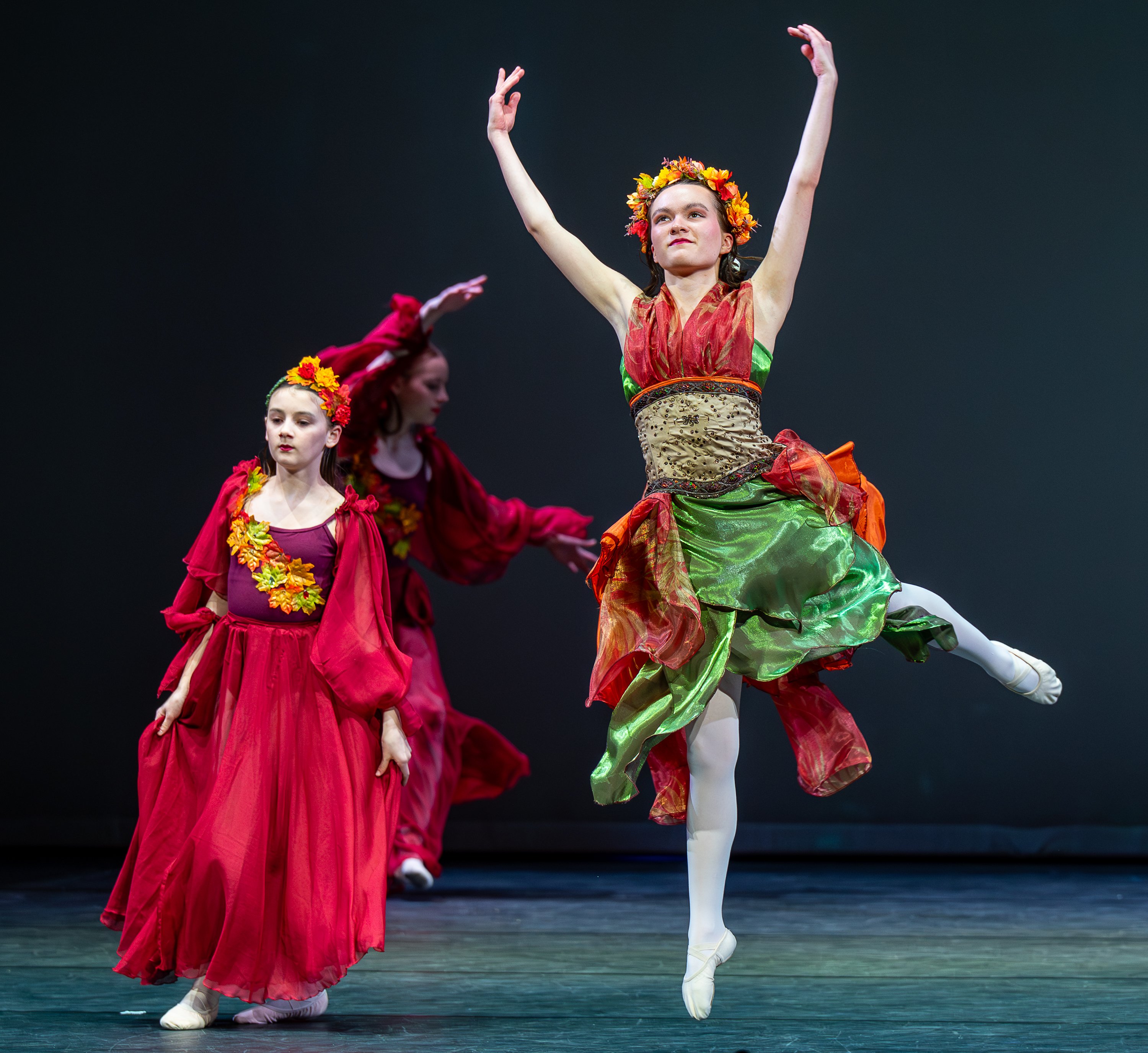 Purchase this imageAUBURN, March 25, 2026 – Molly Tardy, middle, playing the role of the Winter Fairy, leaps through the air during Wednesday night’s dress rehearsal for this weekend’s performance of an adaptation of the classic story of Cinderella created and performed by Ballet LA from the Dance Center in Auburn. Performances will take place Friday at 7PM and Saturday at 1 & 7PM at the Donald M. Gay Performing Arts Center at Edward Little High School in Auburn. (Russ Dillingham/Staff Photographer)