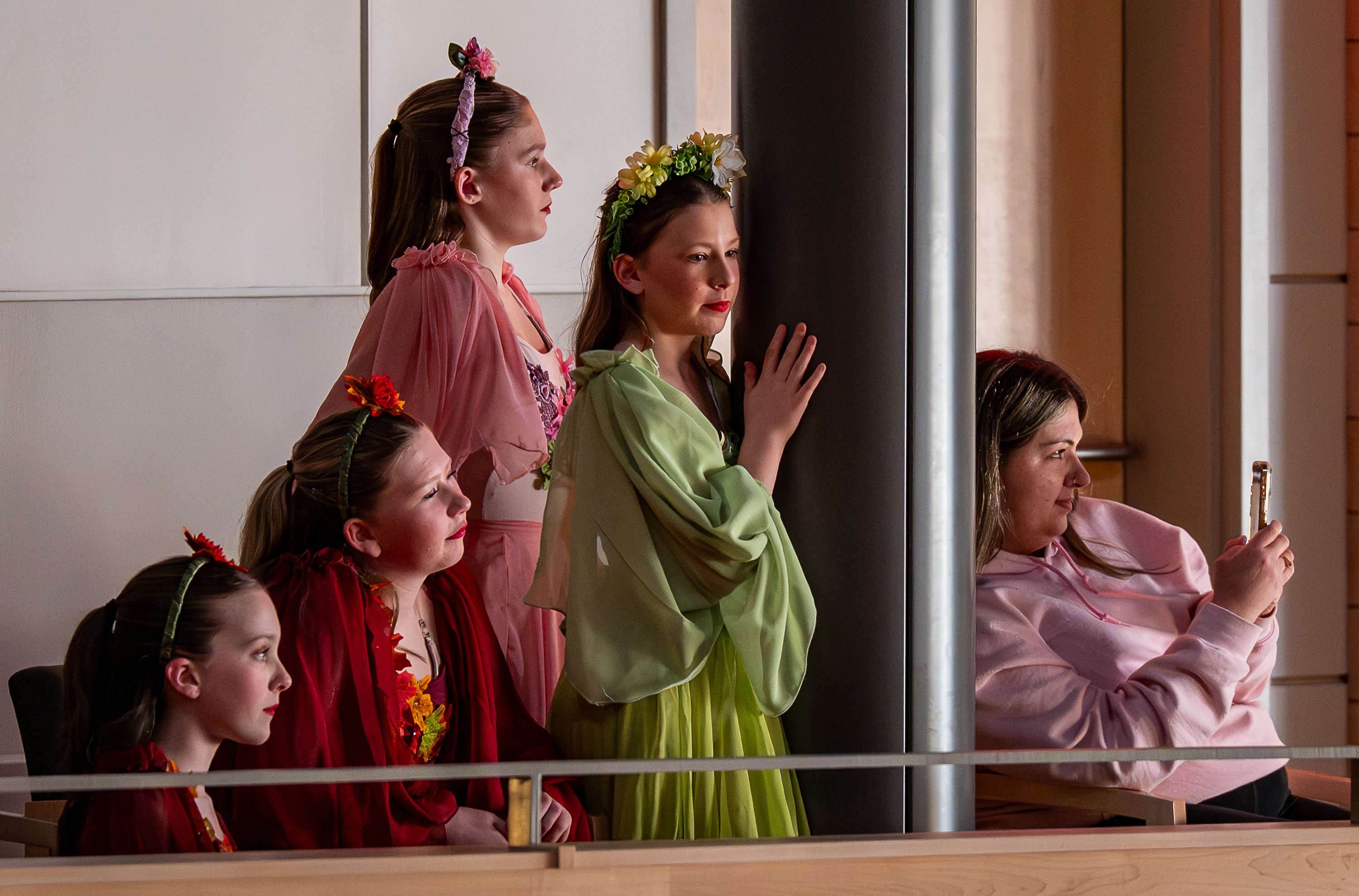 Purchase this imageAUBURN, March 25, 2026 – Dancers watch before their chance to perform during Wednesday night’s dress rehearsal for this weekend’s performance of an adaptation of the classic story of Cinderella created and performed by Ballet LA from the Dance Center in Auburn. Performances will take place Friday at 7PM and Saturday at 1 & 7PM at the Donald M. Gay Performing Arts Center at Edward Little High School in Auburn. (Russ Dillingham/Staff Photographer) AUBURN, March 25, 2026 – during Wednesday night’s dress rehearsal for this weekend’s performance of an adaptation of the classic story of Cinderella created and performed by Ballet LA from the Dance Center in Auburn. Performances will take place Friday at 7PM and Saturday at 1 & 7PM at the Donald M. Gay Performing Arts Center at Edward Little High School in Auburn. (Russ Dillingham/Staff Photographer)