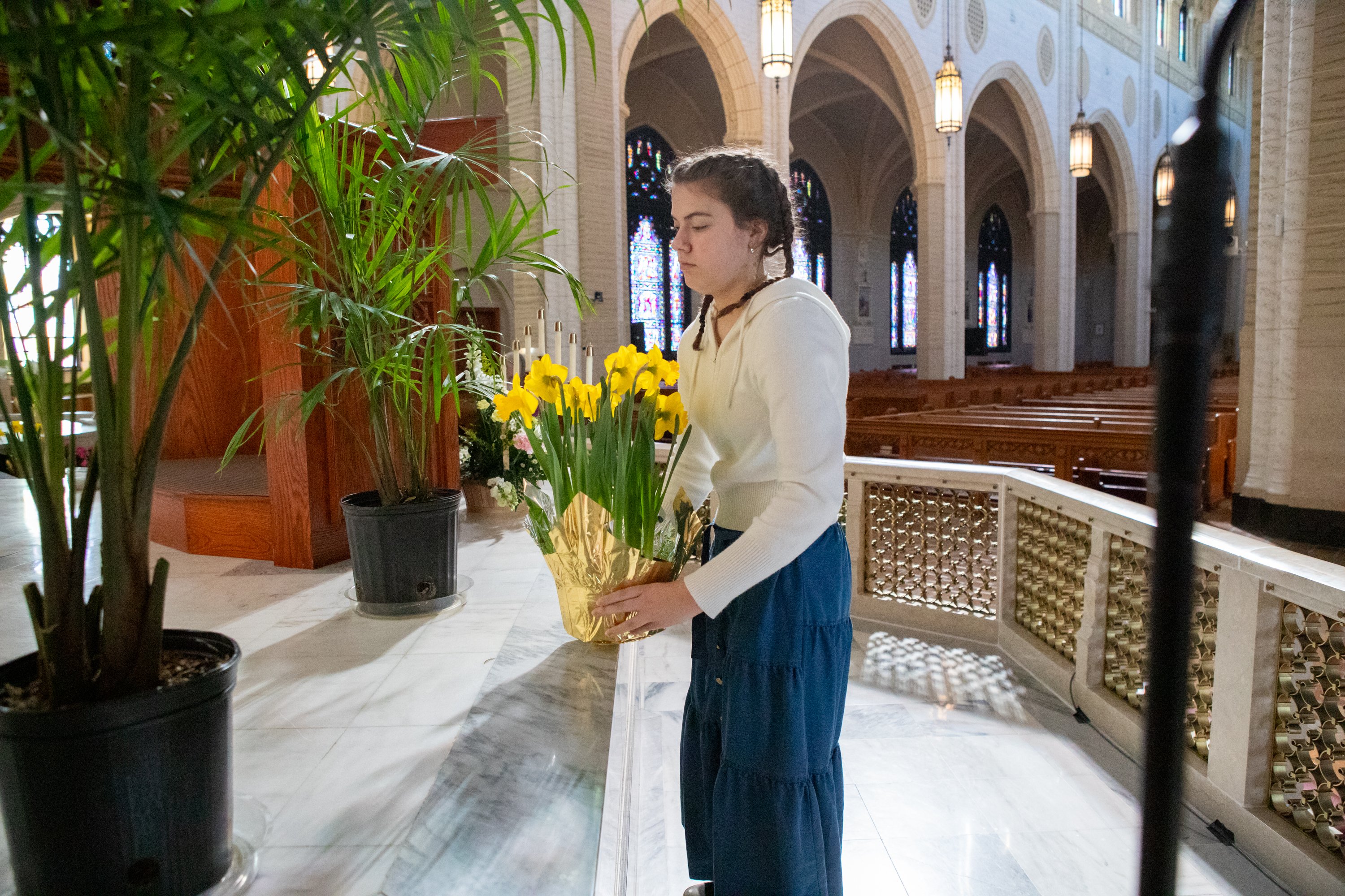 Cassandra Madore sets out flowers to decorate the alter at the Basilica of Saints Peter and Paul in Lewiston. The Basilica, at 122 Ash St., will have Easter Sunday services at 7, 8:30, and 10:30 a.m., along with a 1 p.m. service that will be in Burundi. (Libby Kamrowski Kenny/Staff Photographer)
