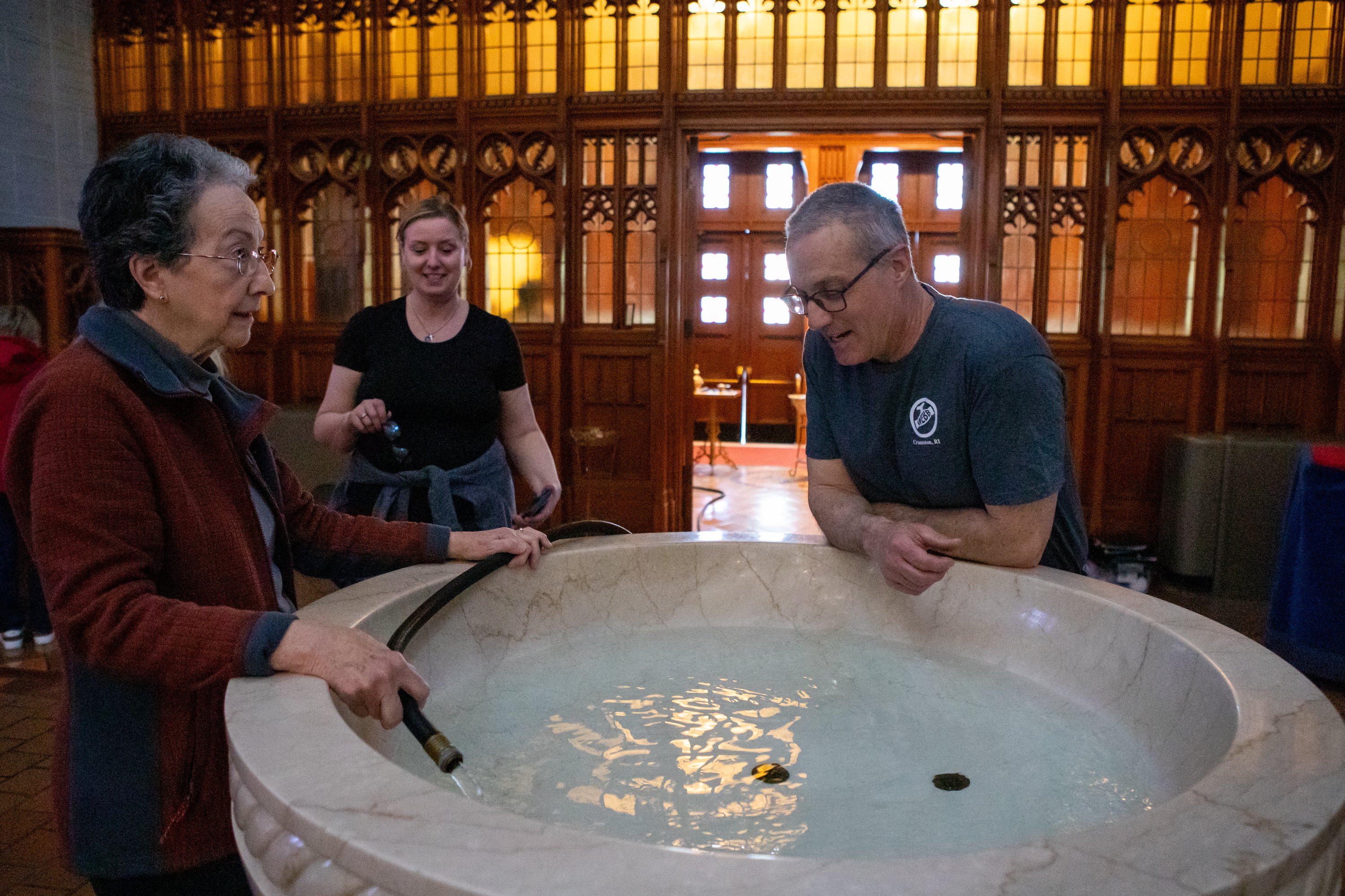 Purchase this imageLEWISTON, MAINE – April 4, 2026. Connie LaPointe and sacrister Jeff Caron fill the baptismal font Saturday at the Basilica of Saints Peter and Paul in Lewiston. The water is ordinary until Fr. Dan Greenleaf blesses it at the Easter Vigil on Saturday night, preceding Easter Sunday services. Baptismal candidates will be baptized at the vigil without being submerged, as Greenleaf will apply water to their foreheads. (Libby Kamrowski Kenny/Staff Photographer)
