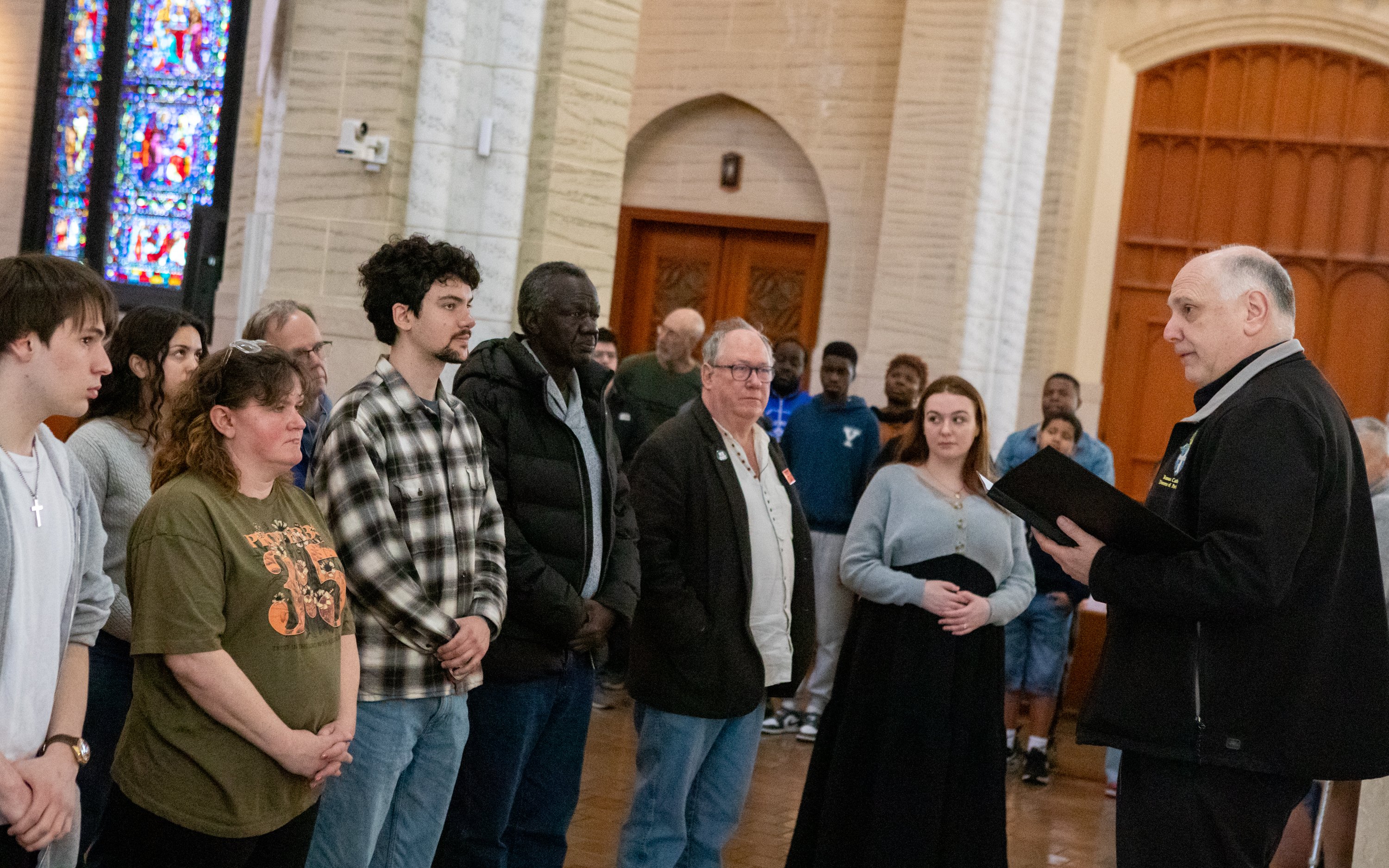 Purchase this imageLEWISTON, MAINE – April 4, 2026. Fr. Dan Greenleaf leads a rehearsal for the Easter Vigil Saturday at the Basilica of Saints Peter and Paul in Lewiston. The vigil is a special service where people are baptized after months of learning from sponsors, others who are already baptized, and take their first communion. (Libby Kamrowski Kenny/Staff Photographer)