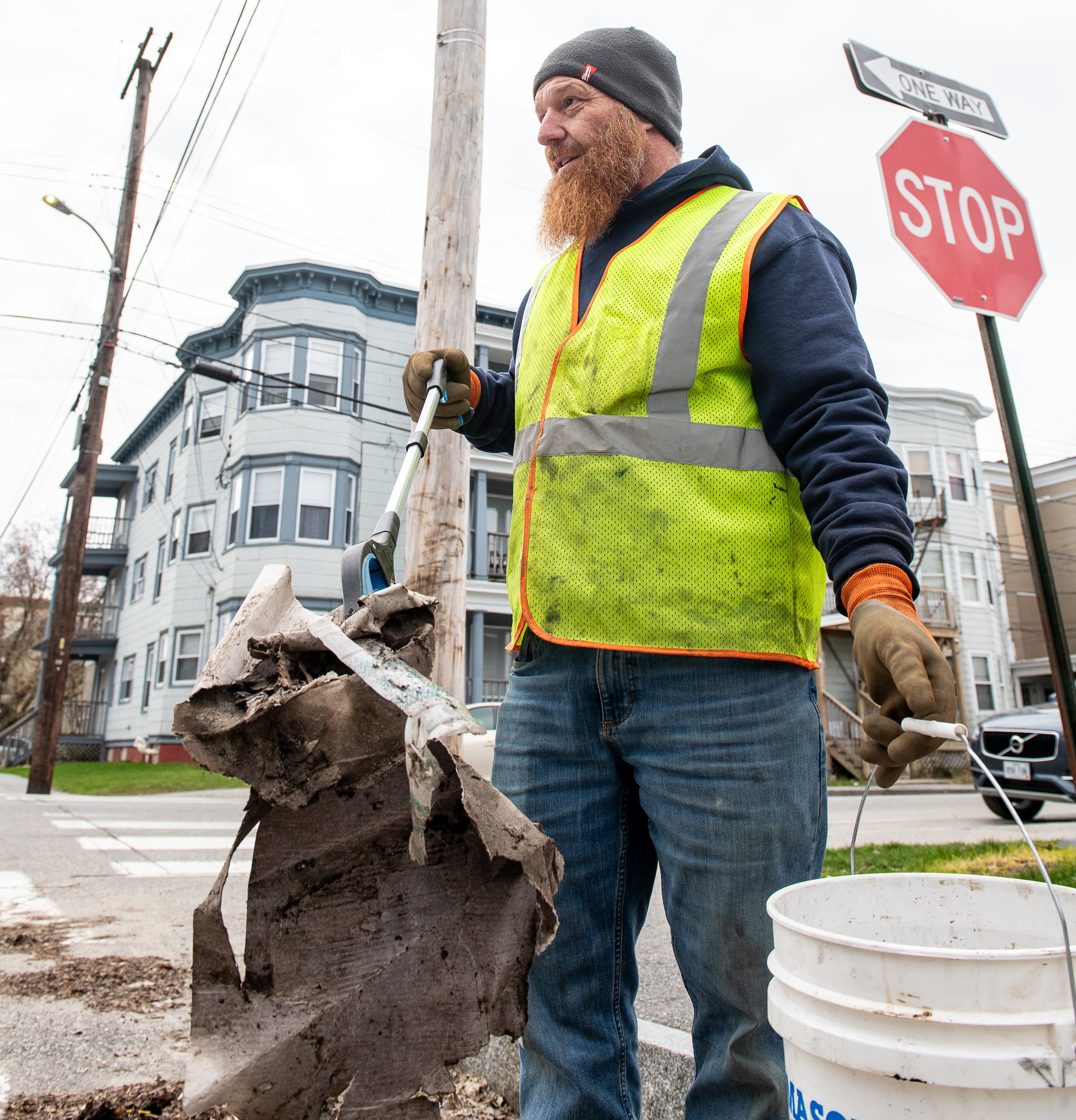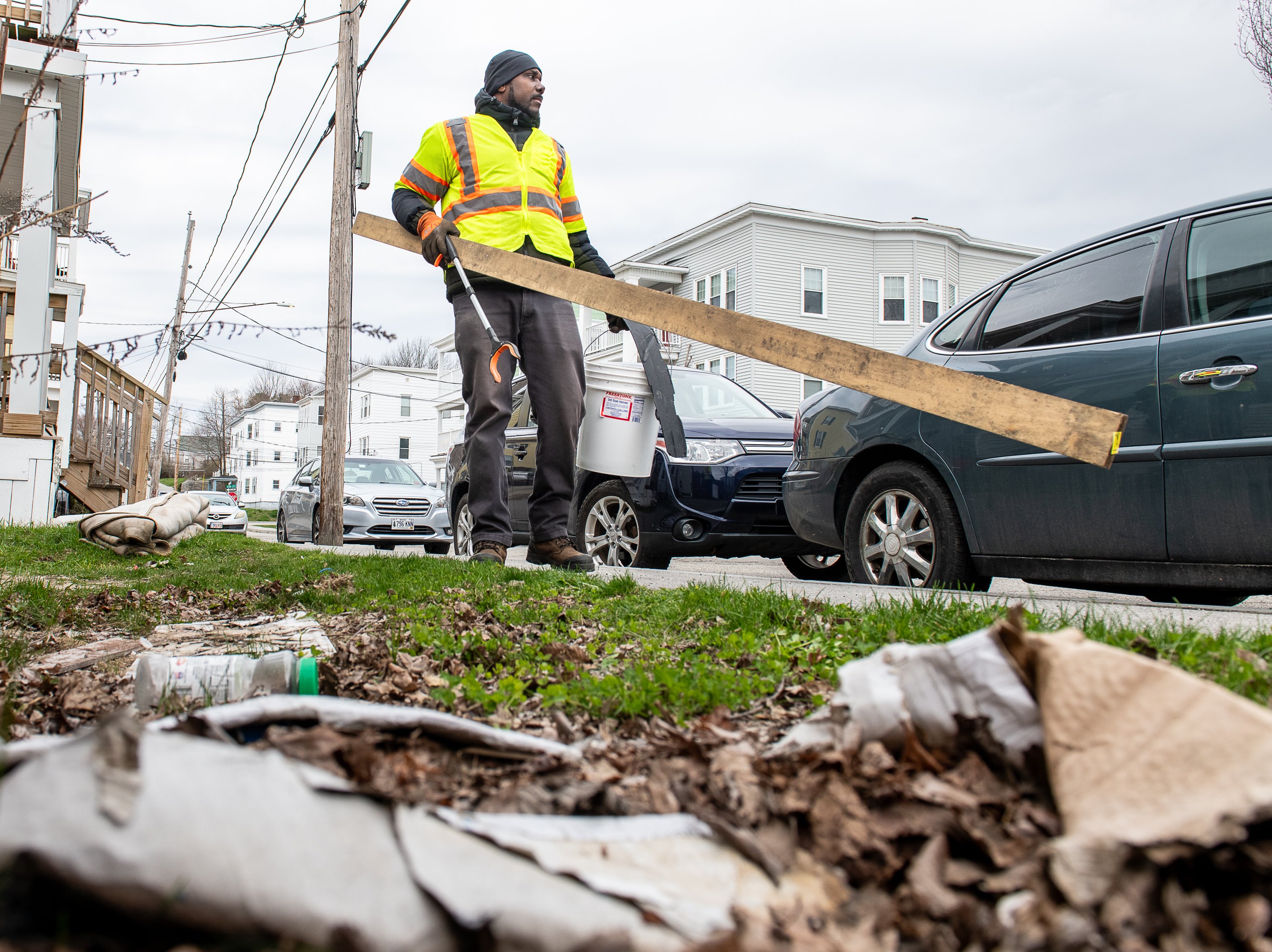 Lewiston Public Works employee Thorpe Radcliff picks up debris on Bradley Street on Earth Day on Wednesday morning. (Russ Dillingham/Staff Photographer)
