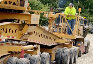 Mike Tremblay, a rigging foreman for Reed & Reed, was busy attaching tower sections to the crane Tuesday. A Moscow, Maine, resident, Tremblay has been employed for the past five years on wind-power projects.