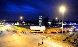 Beyond the two turbine blades and the nacelle, two more trucks hauling steel tubular sections of the wind turbine’s tower will go out.