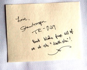 In time, the couple realized that an aunt and her boyfriend saw the fully costumed stormtrooper in front of the local movie theater promoting the movie’s opening. They pulled him aside and paid him $100 to crash the reception and surprise the newlyweds.