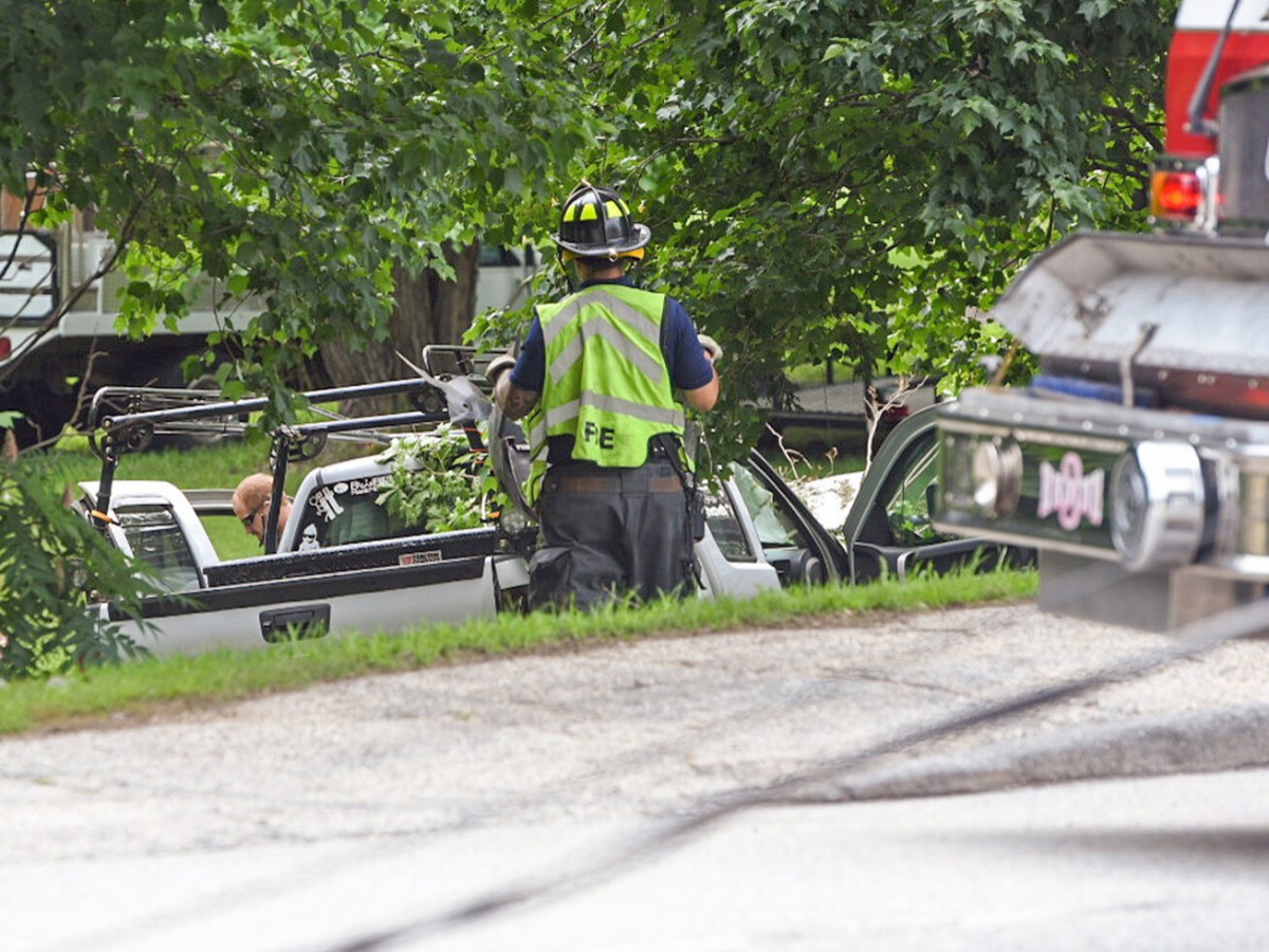 The pickup truck went down an embankment and stopped on the lawn of a home.