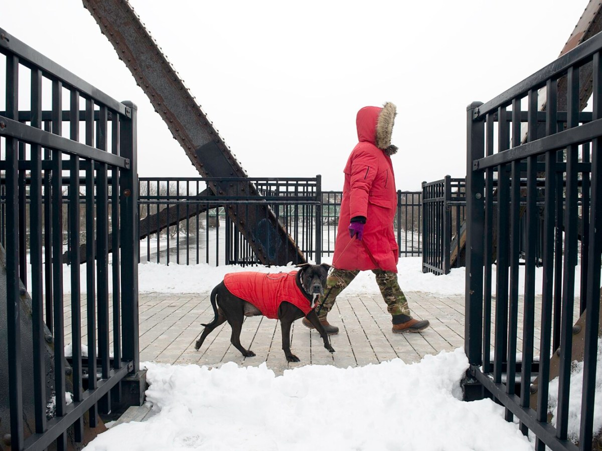 Olga Dolgicer of Auburn and her dog, Hurricane, walk Friday along the pedestrian bridge between Simard-Payne Memorial Park in Lewiston and Bonney Park in Auburn.