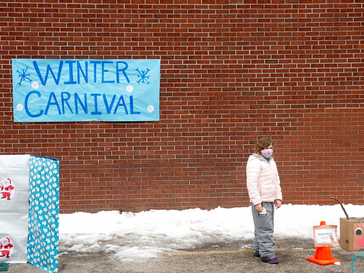 Masks and a foot of fresh snow hide smiling faces at Auburn ski area.