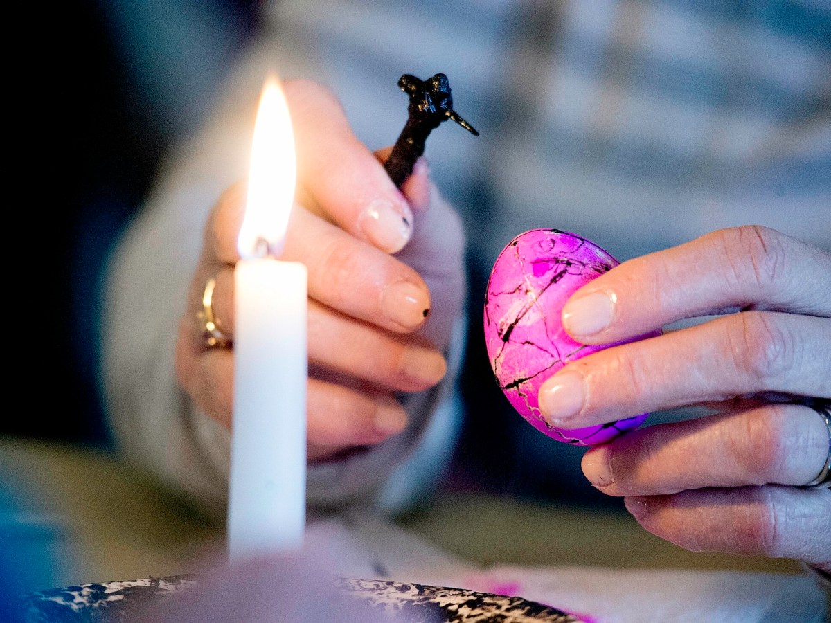 Lesia Sochor of Brooks demonstrated the art of Ukrainian egg-painting to a group of 21 women at Bates College in Lewiston on Friday.