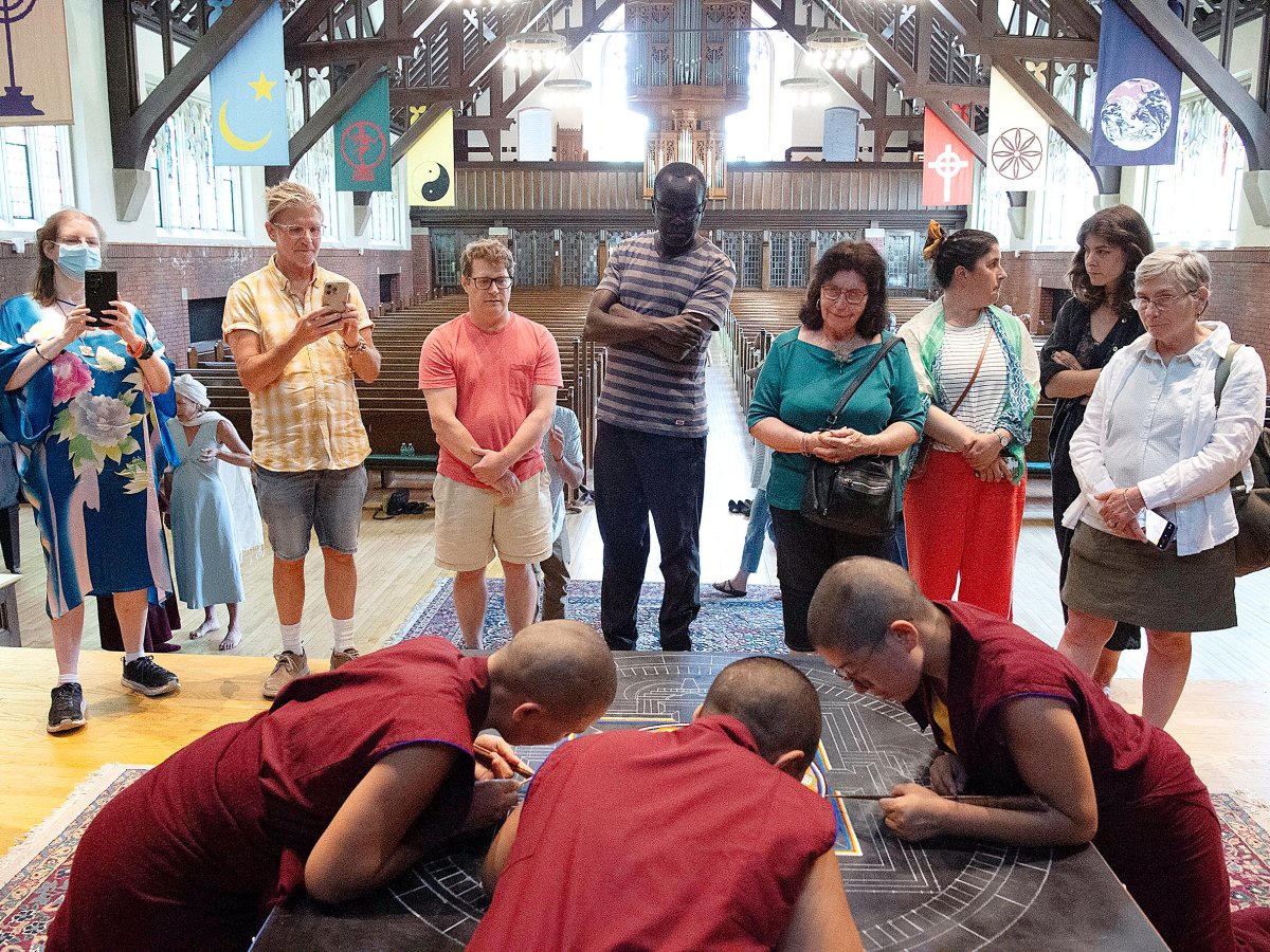 As they work inside Bates College’s Peter J. Gomes Chapel from 9 a.m. to 5 p.m. this week, the nuns said they encourage the public to come and view the medicine Buddha sand mandala as it is being created.