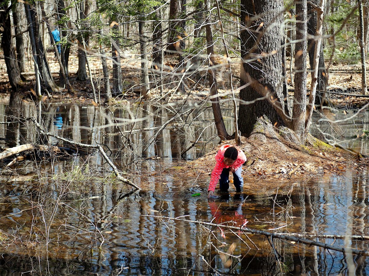 Students search for salamanders and wade through a vernal pool during annual field trip