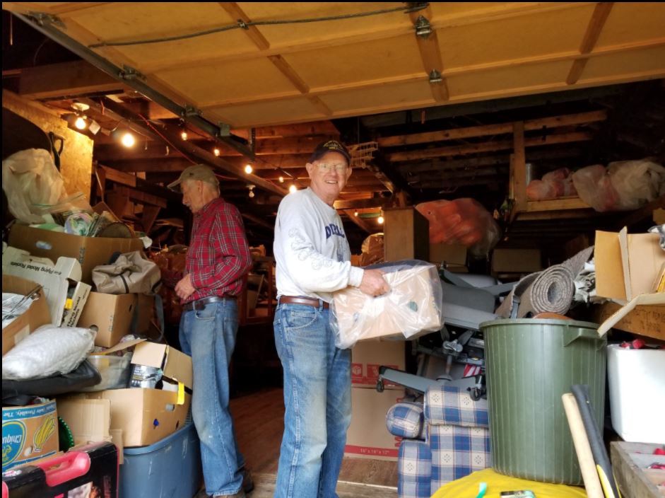 Bruce Ibarguen and Bill Groder, both of Wilton, were moving items around Tuesday at the Wilton Lions Club storage building.