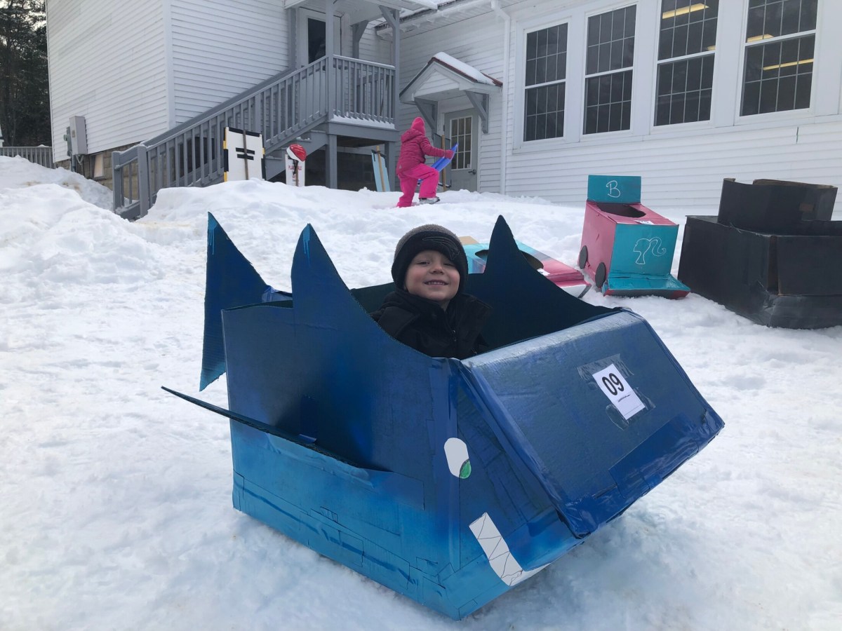Cardboard racers speed down track during the Otisfield Winter Carnival