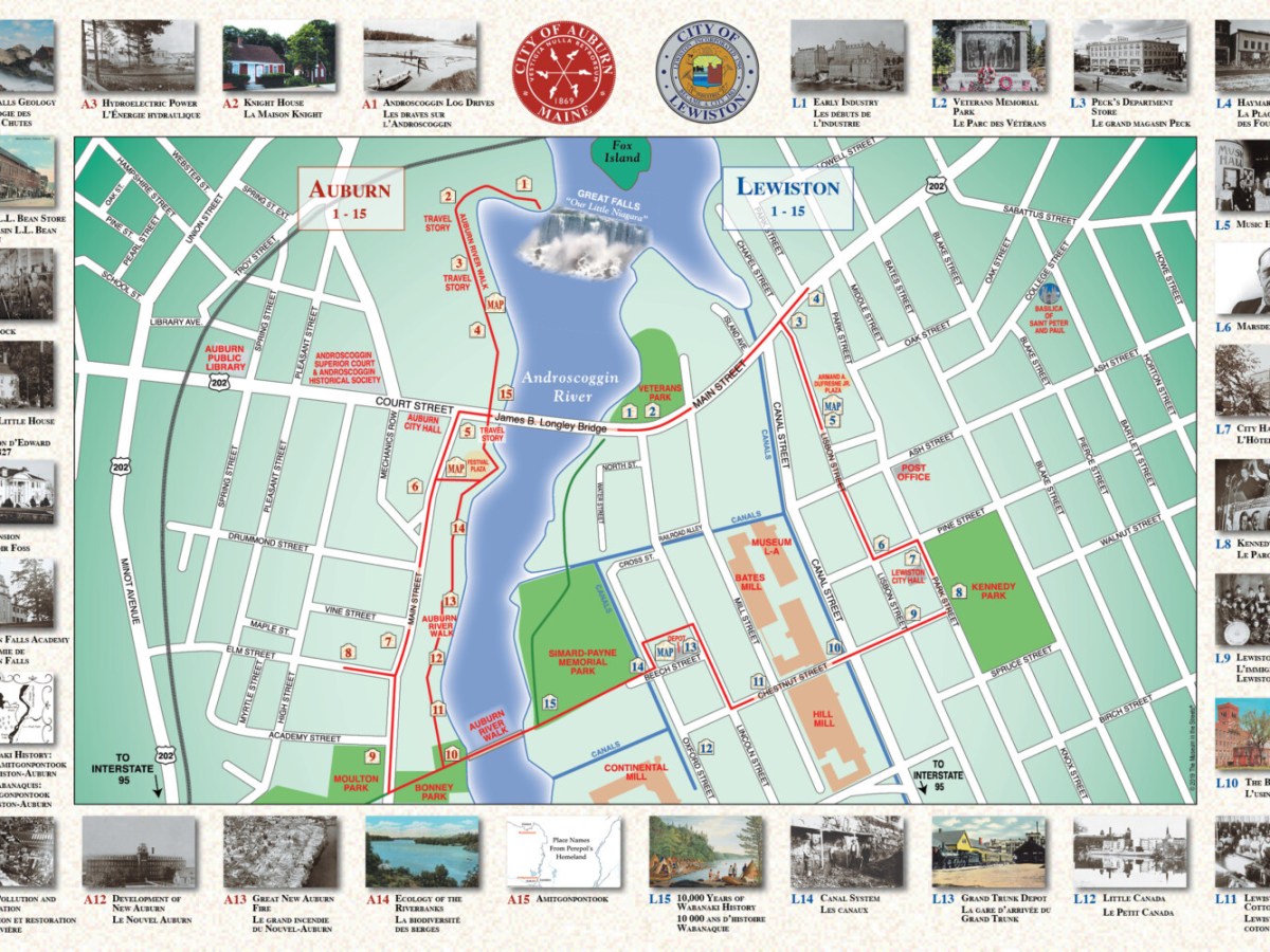 Thirty historical markers along the Androscoggin River tell the history of the Twin Cities.