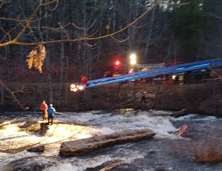 Firefighters used a Gardiner Fire ladder truck to pluck pair from rock in swollen river on Saturday.