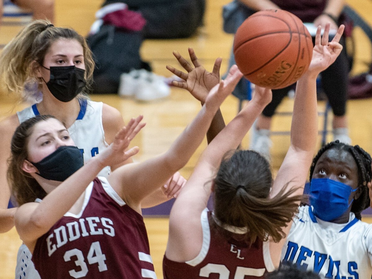 Girls basketball: Natalie Beaudoin and Myah Nicolas make key 3-pointers for the Blue Devils in the fourth quarter after the Red Eddies rally to within four points with a 13-0 run.