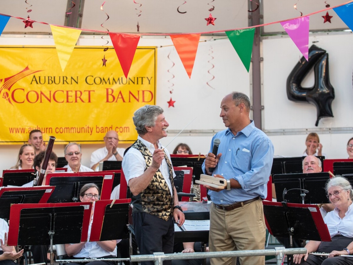 Milt Simon is recognized during Wednesday’s concert for his 40 years of conducting the Auburn Community Band.