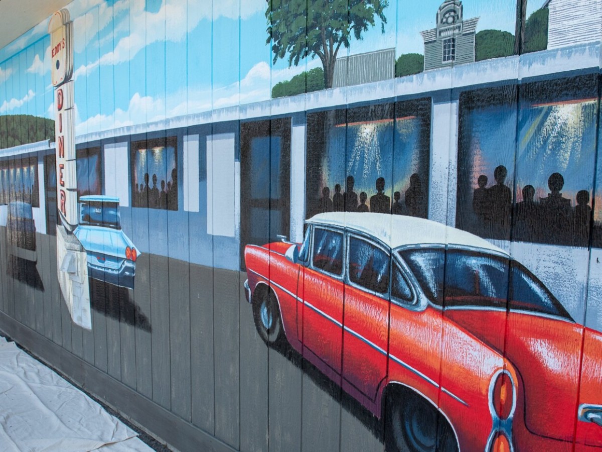 The owners of Village Inn in Auburn commissioned Rumford artist Clint Magoon to paint a mural of their first business, located across the street.