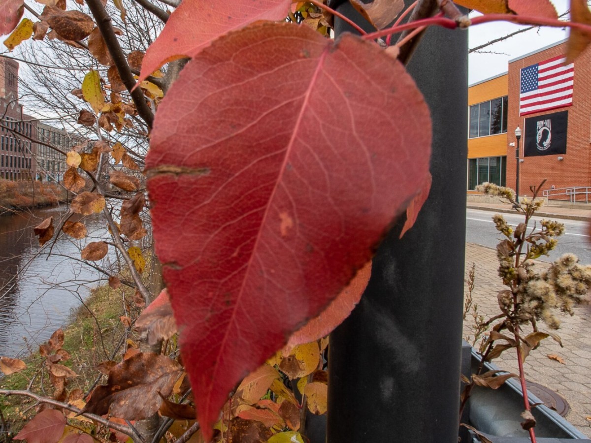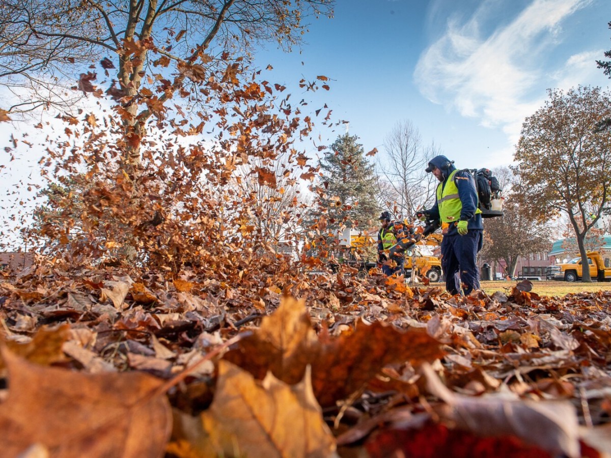 City employees blow leaves and install lights in Kennedy Park in Lewiston.