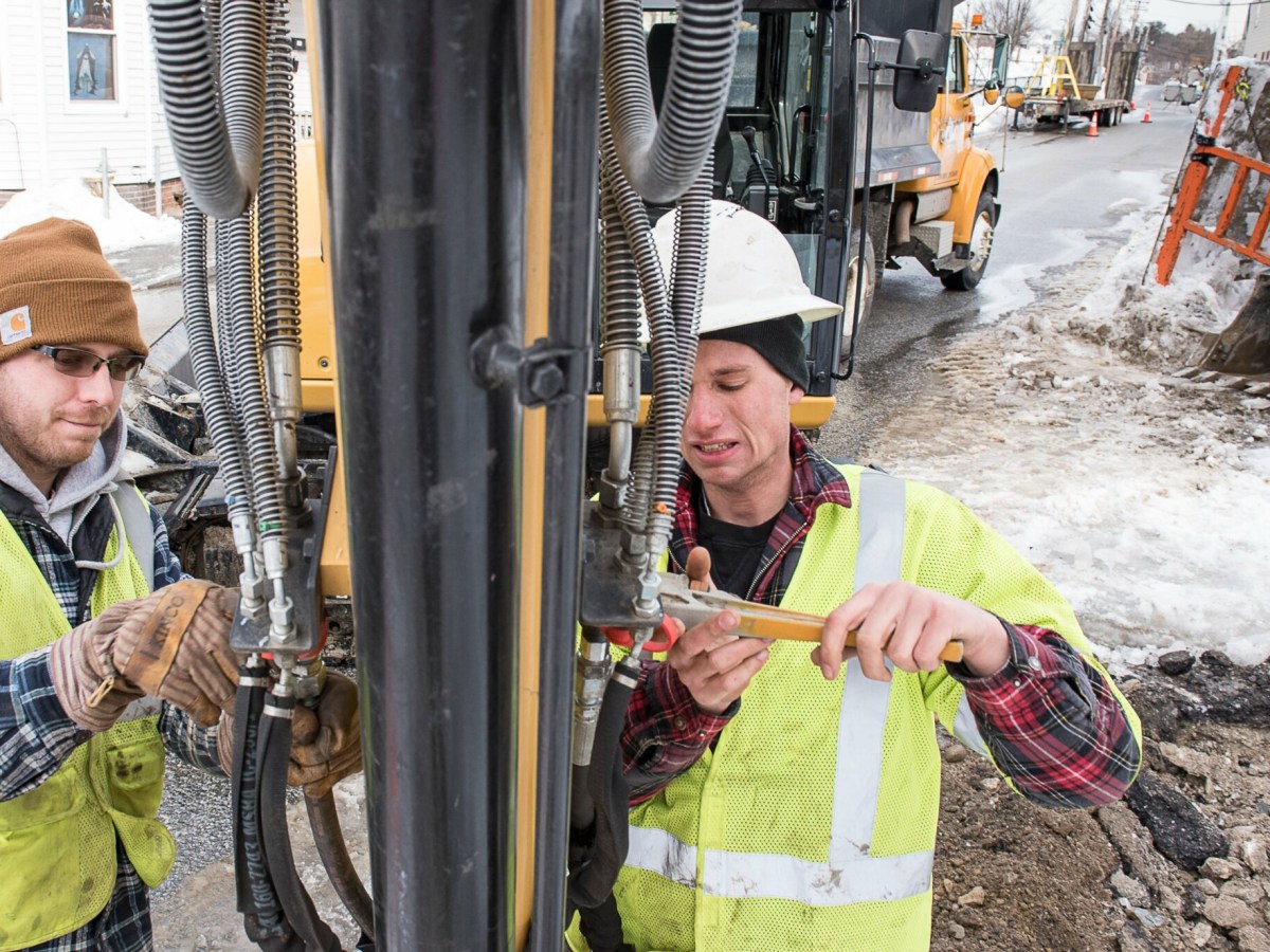 A crew from St. Laurent & Son dig out a stubborn rock at a water break on Oak Street in Lewiston Monday morning.
