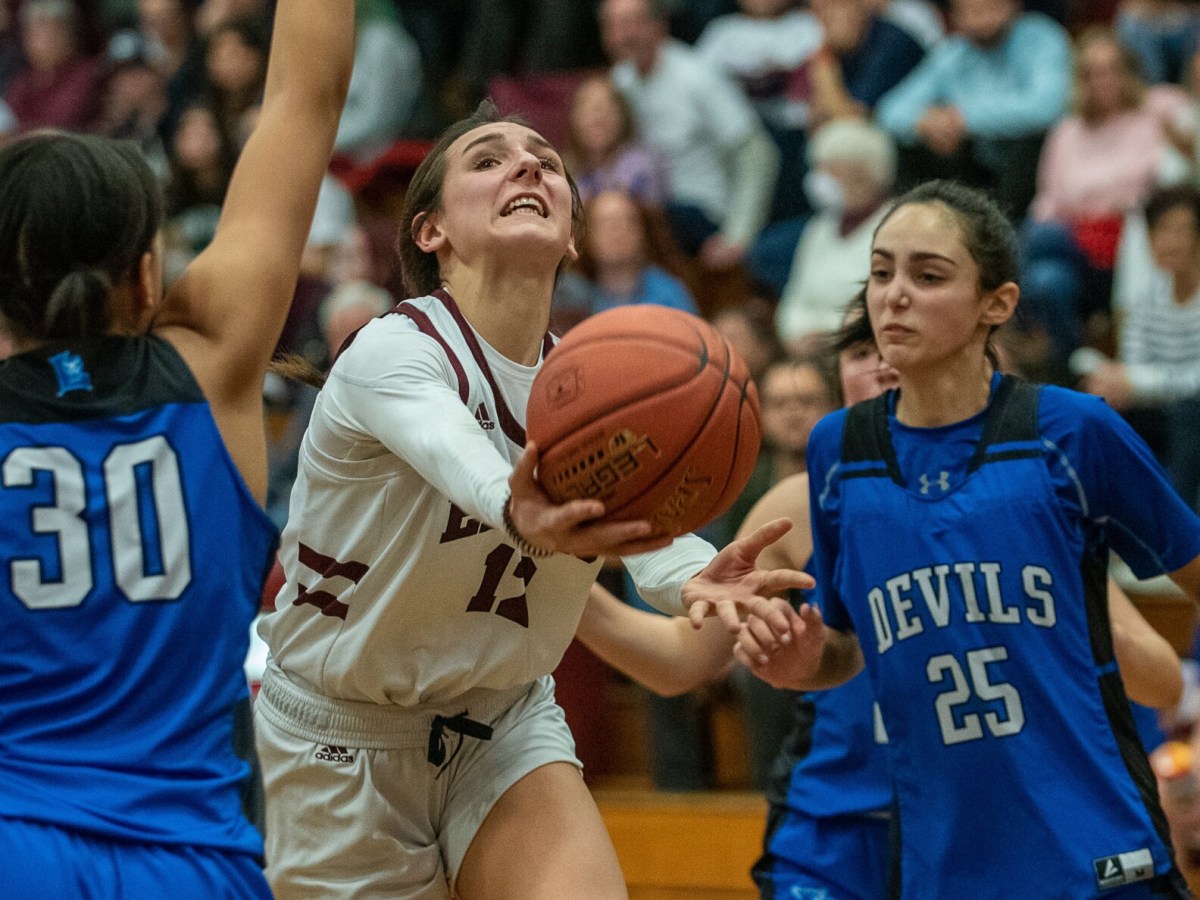 The Red Eddies take control with a 15-0 second-quarter run and beat the Blue Devils in the final girls varsity basketball game at the Edward Little High School gym.