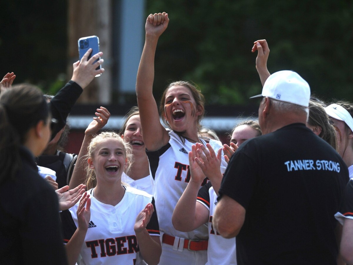 Corinne Vasvary scores on passed ball in the 7th inning as Tigers take Class B crown and their first championship since 1980.
