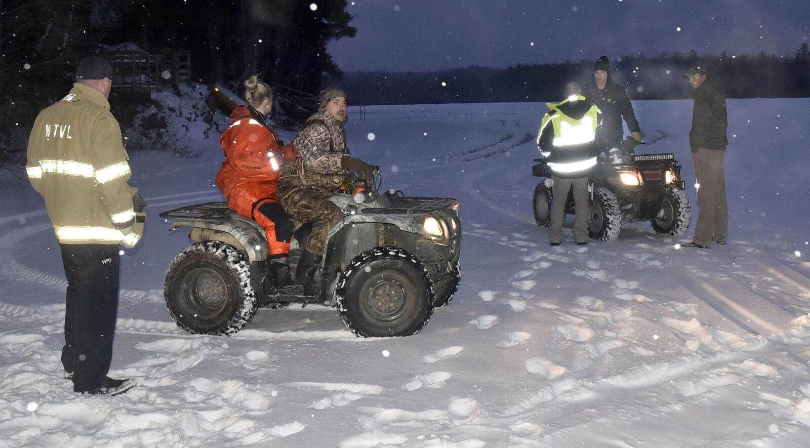 Waterville fire Chief Shawn Esler, left, watches as a city firefighter wearing a dry suit gets a ride on an all terrain vehicle to the scene where a horse reportedly was in water up to its neck in Pattee Pond off the North Pond Road in Winslow late Monday afternoon. Winslow fire Chief Ronnie Roderiguez at right speaks with another rescuer. Firefighters and residents rushed to the remote section of the pond in an attempt to rescue the horse. David Leaming photo 01062020