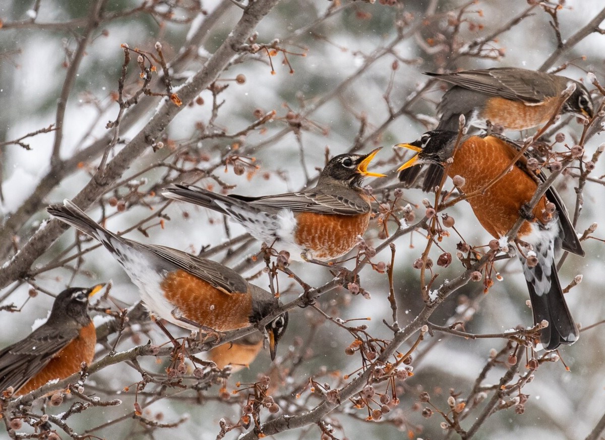Dozens of Canada robins flock to trees and bushes to feed Wednesday morning in Lewiston.