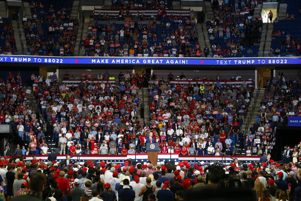 When the president took the stage, the crowd was clustered together and not leaving empty seats between themselves.