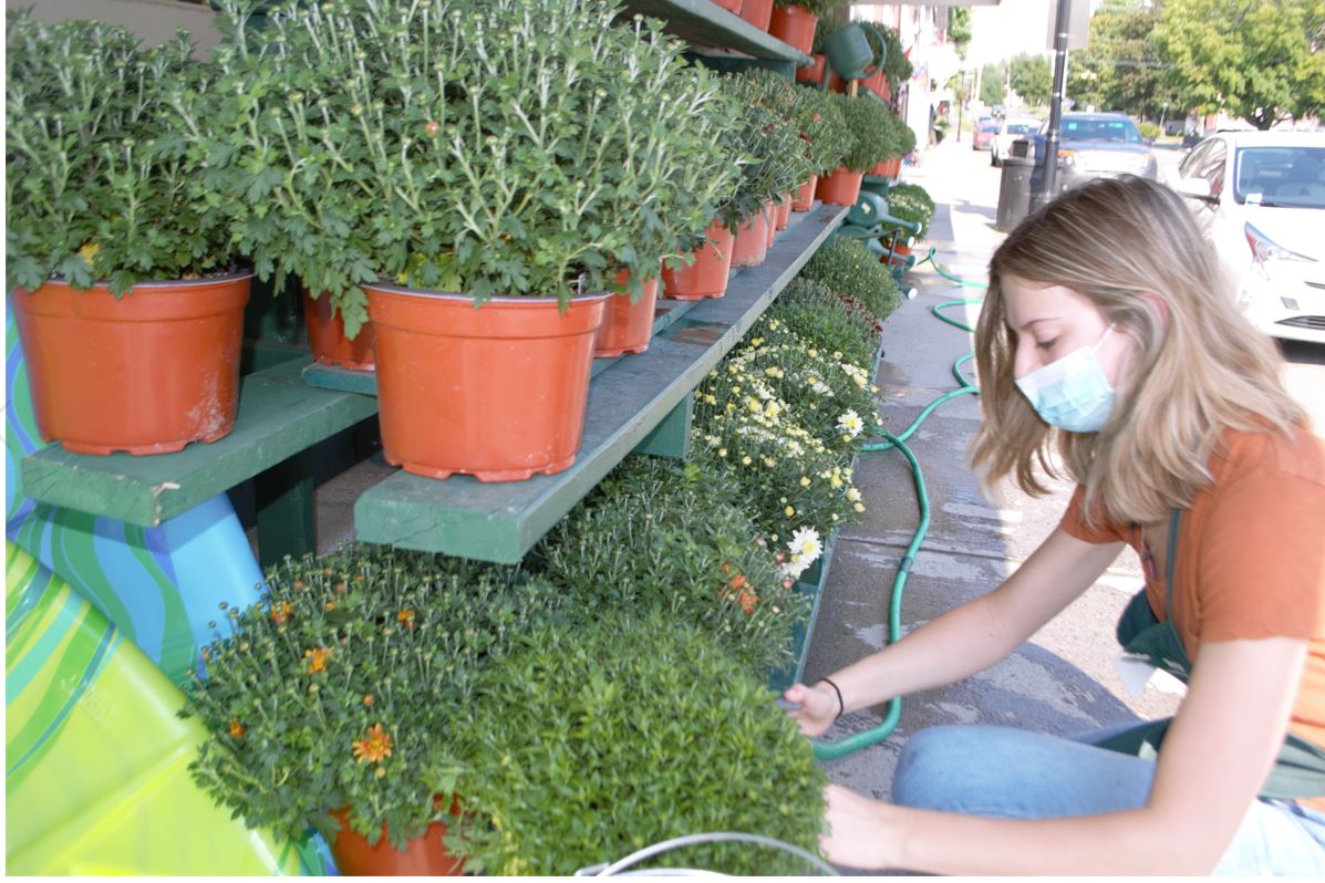 Carrie Burr, 19, of Farmington watered the mums that were put out in front of Renys on Thursday in Farmington.