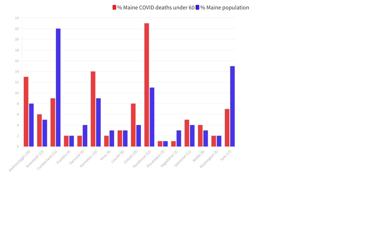 Data from the Maine Center for Disease Control & Prevention shows that 52 residents of Androscoggin, Franklin or Oxford counties under the age of 60 have died from the disease since the pandemic began.