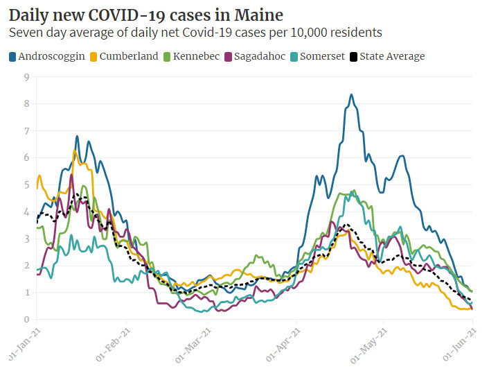Lewiston’s Central Maine Medical Center reported no confirmed COVID-19 inpatients in critical care Monday and Tuesday, a first since March.