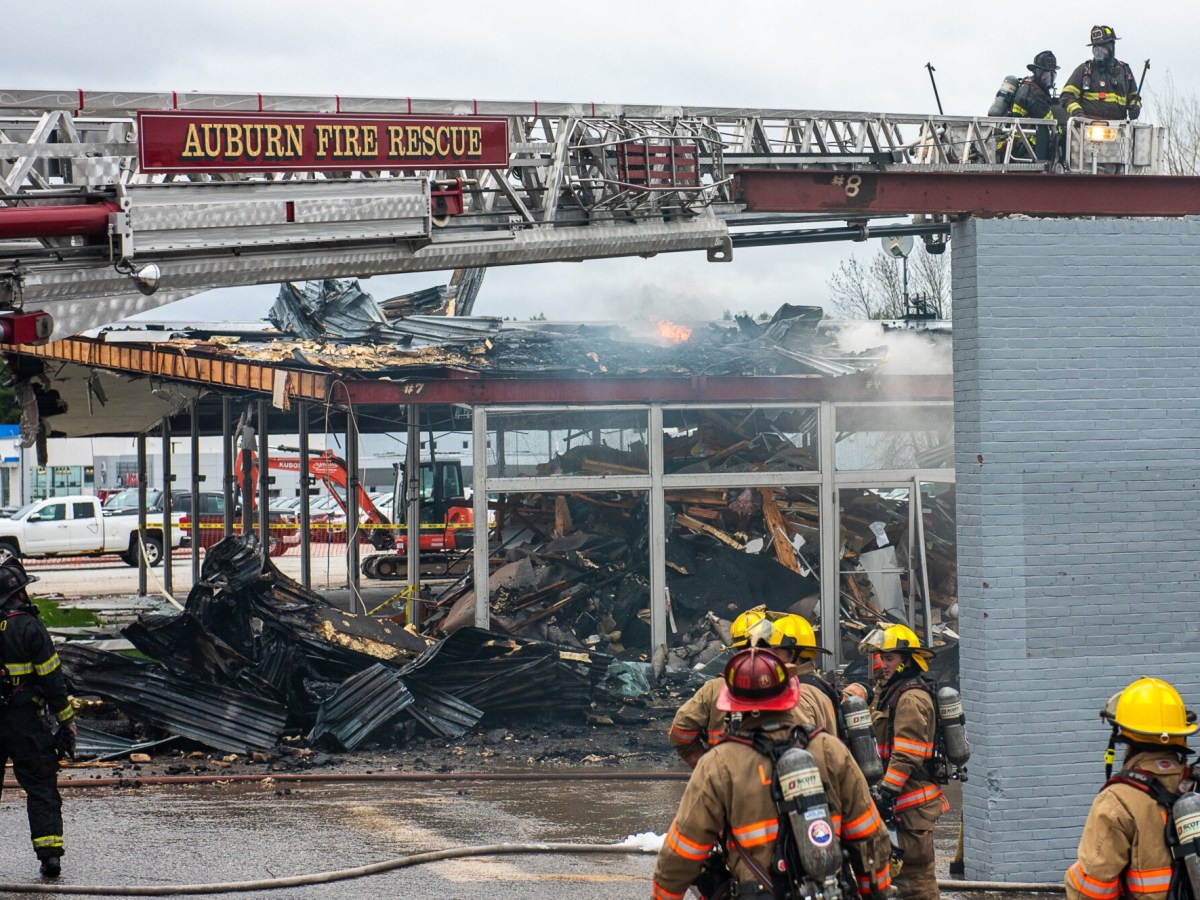 By the time flames were brought under control at the Auburn car dealership, a section of the empty building had collapsed.
