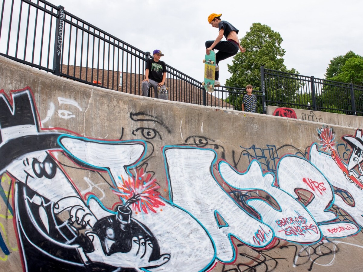 Skateboarders take to the air between rain showers Tuesday afternoon.