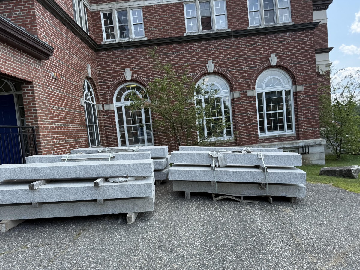 Jay-Niles Memorial Library restores its historic front stairs using local granite and a $50,000 grant from the Stephen and Tabitha King Foundation.