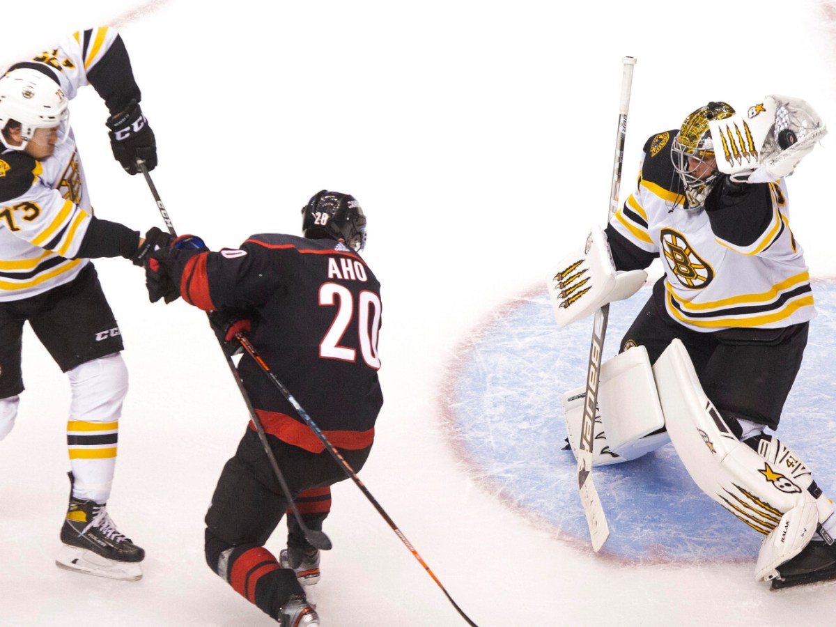 Boston overcomes the loss of its top goaltender and beats Carolina 3-1 to take a 2-1 lead in the first-round series.