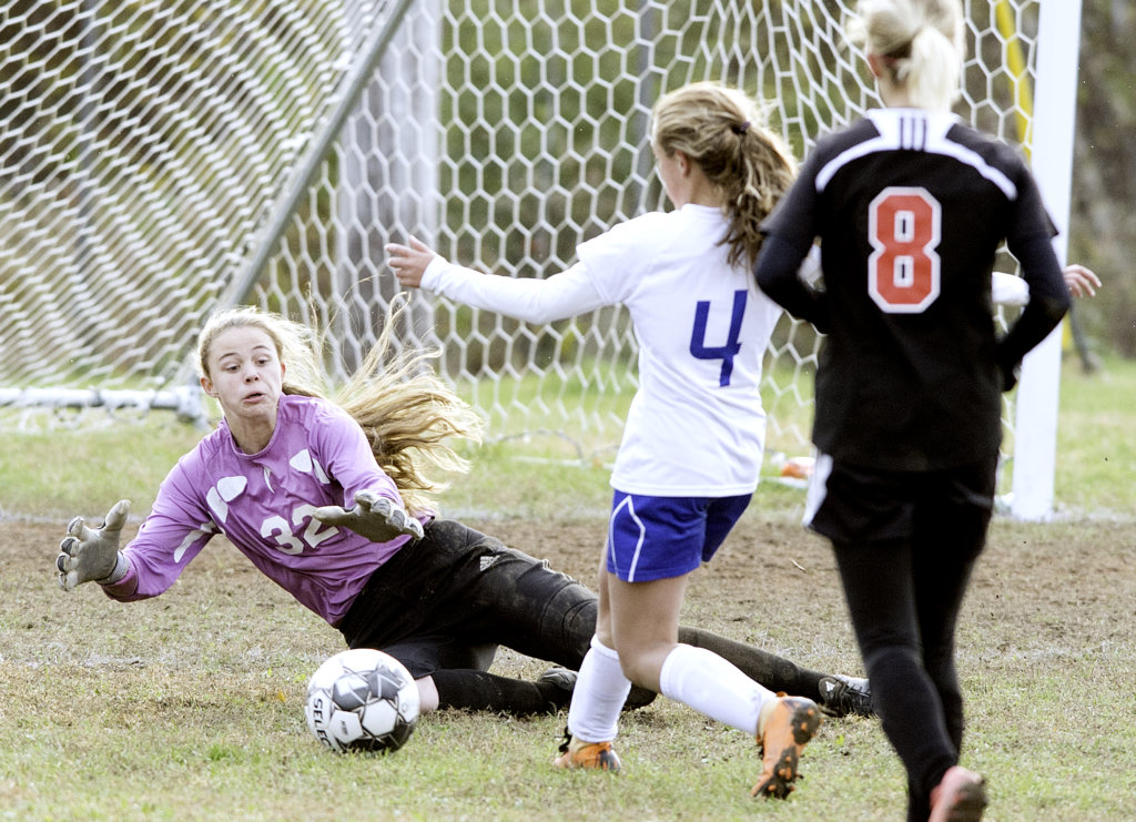 Lisbon goalkeeper Sarah Haggerty jumps on a shot by Kaylee Knight of Mt. Abram during the second half in Lisbon on Wednesday. Haggerty made the save. (Daryn Slover/Sun Journal) LISBON — The Lisbon goalie was on the ground, Mt. Abram was down 1-0 in the second half and Kaylee Knight was hurtling toward a wide […]