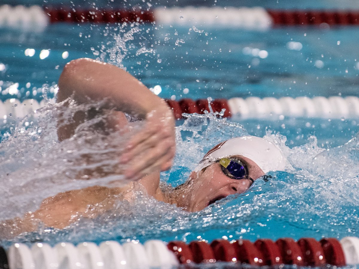 Trailing by a whisker entering the final race, the Red Storm win the 400-yard freestyle relay to clinch the meet.