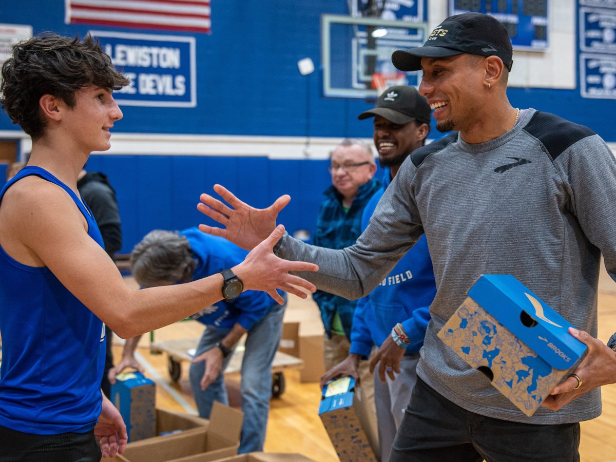 Harris, now a professional runner for the Brooks Beasts, inspires and hands out sneakers to the Lewiston High School track team.