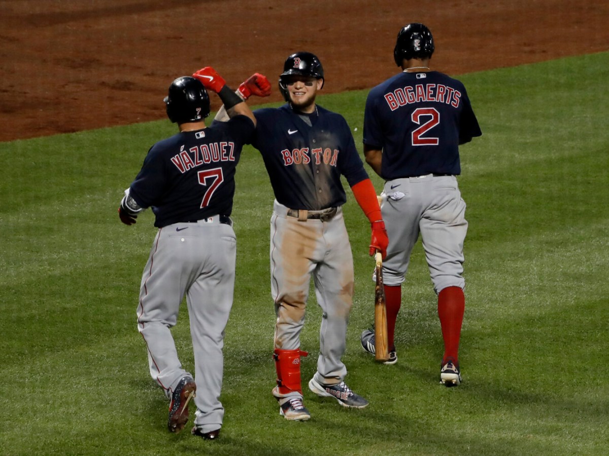 Mitch Moreland also homers and Boston’s bullpen allows one run in six innings in a 5-3 win.