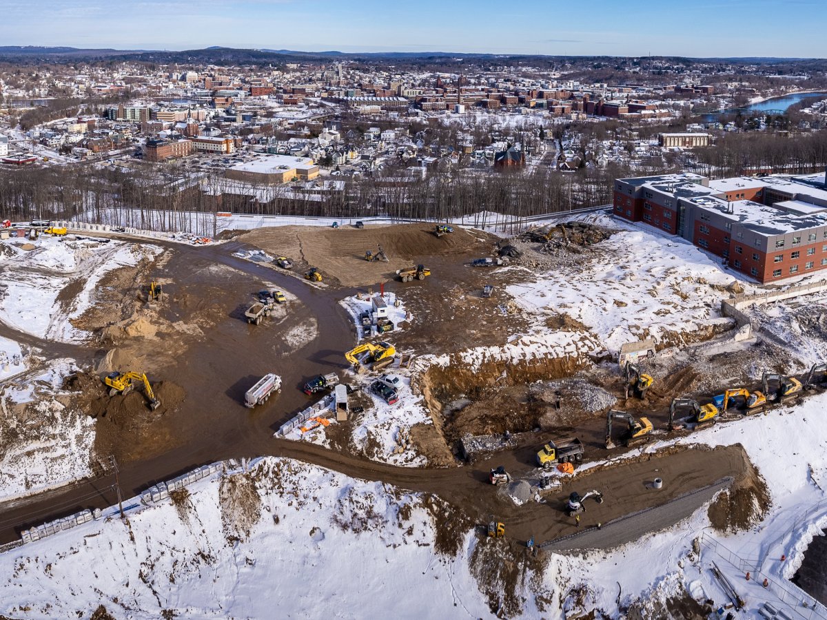 An aerial view of the construction and demolition at the new Edward Little High School in Auburn.