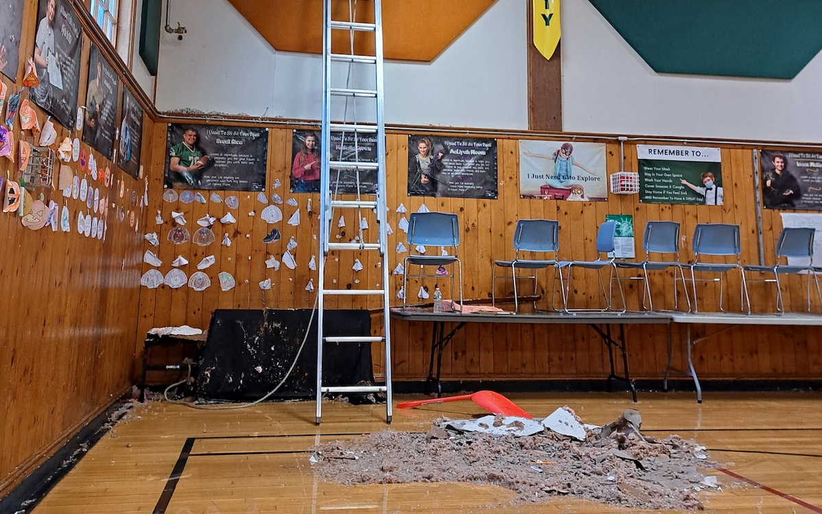 A sprinkler system pipe had burst and flooded the cafeteria and gym.
