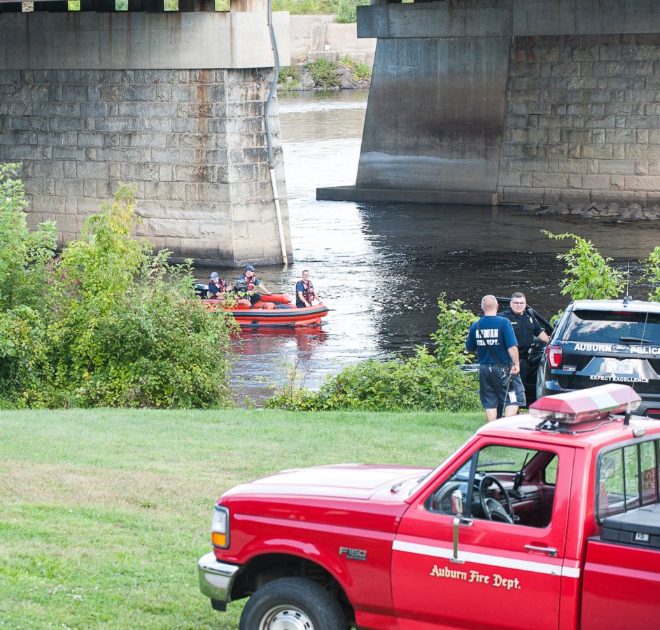 Auburn rescue workers return Thursday afternoon to the boat ramp behind Festival Plaza after assisting Lewiston police in the search for a woman who had been seen on the rocks near Great Falls on the Androscoggin River. The woman was located on land and taken to a Lewiston hospital for evaluation. (Russ Dillingham/Sun Journal)