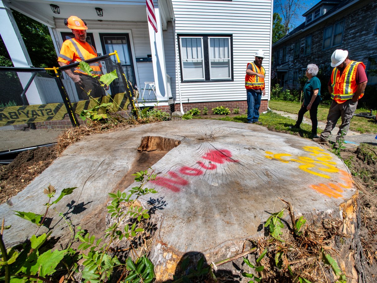 The tree, one of two 100-foot tall sister trees, was taken down last fall.