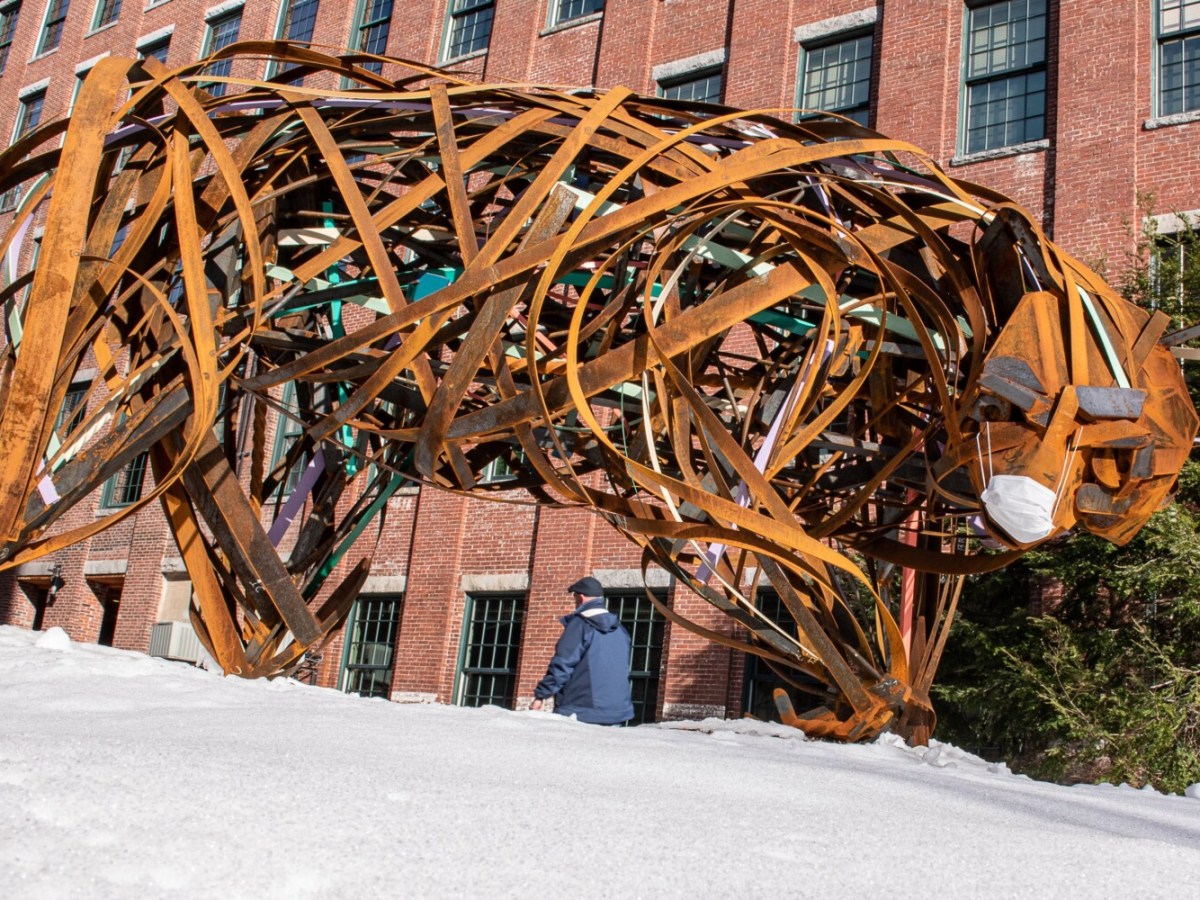 A piece of art at the Bates Mill Complex in Lewiston has a poignant message strapped to it.