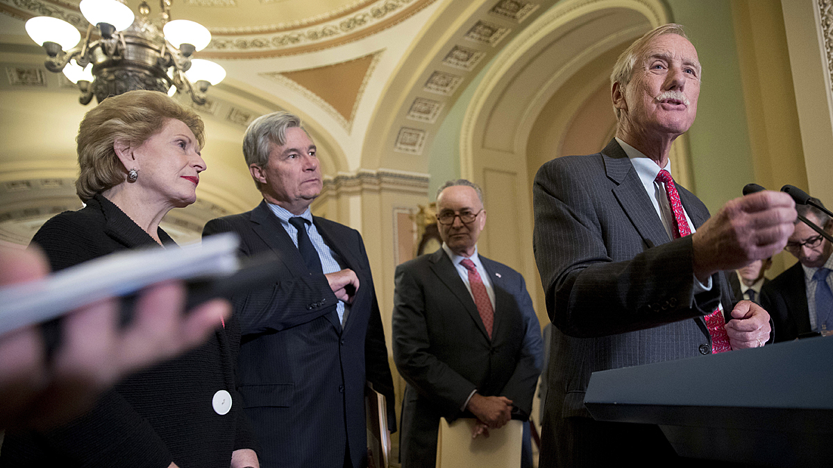 Sen. Angus King, I-Maine, right, accompanied by, from left, Sen. Debbie Stabenow, D-Mich., Sen. Sheldon Whitehouse, D-R.I., and Senate Minority Leader Chuck Schumer, D-N.Y., speaks to reporters on Capitol Hill in Washington on Tuesday, after Senate policy luncheons. The Democratic National Committee may turn up the heat on two independent U.S. senators who caucus with […]