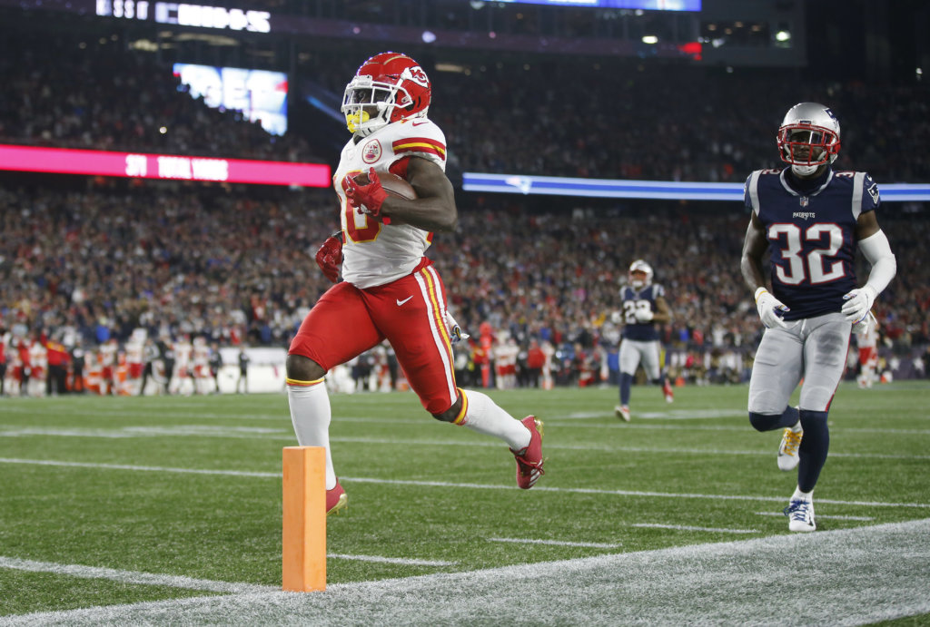 Kansas City Chiefs running back Kareem Hunt (27) crosses the goal line to score a touchdown past New England Patriots safety Duron Harmon, center, and linebacker Kyle Van Noy, top right, during the second half Thursday, Sept. 7, 2017, in Foxborough, Mass. New England Patriots head coach Bill Belichick instructs players on the sideline during […]