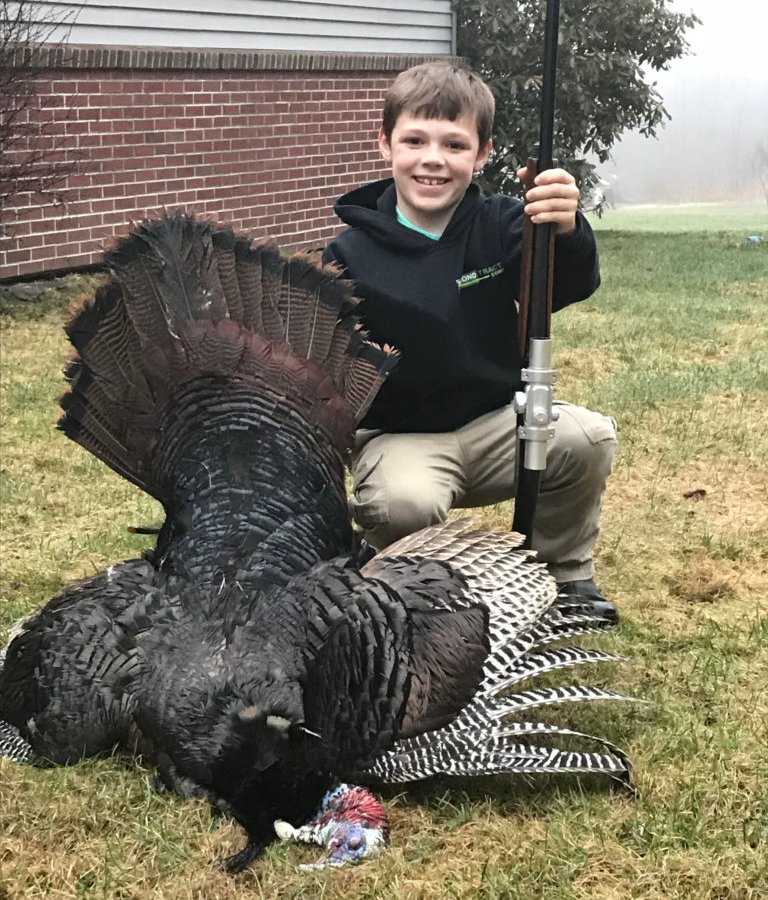 Brayden Nadeau with his 23 pound turkey he shot on April 28. Brayden Nadeau of Minot shot a 23 pound turkey on youth day on April 28 while hunting with his grandfather Dan Herrick in Auburn. It was the eight year old’s first time hunting and got it on his shot.
